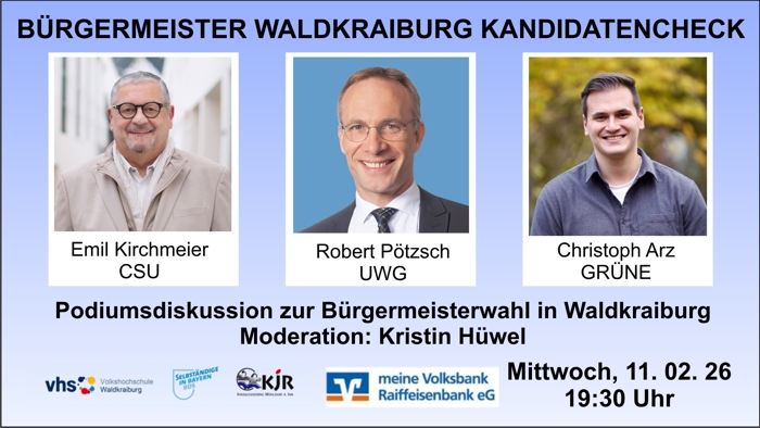 Aufzeichnung des Kandidatencheck von VHS, BDS und KjR Waldkraiburg mit den Kandidaten für die Wahl zum Bürgermeister von Waldkraiburg